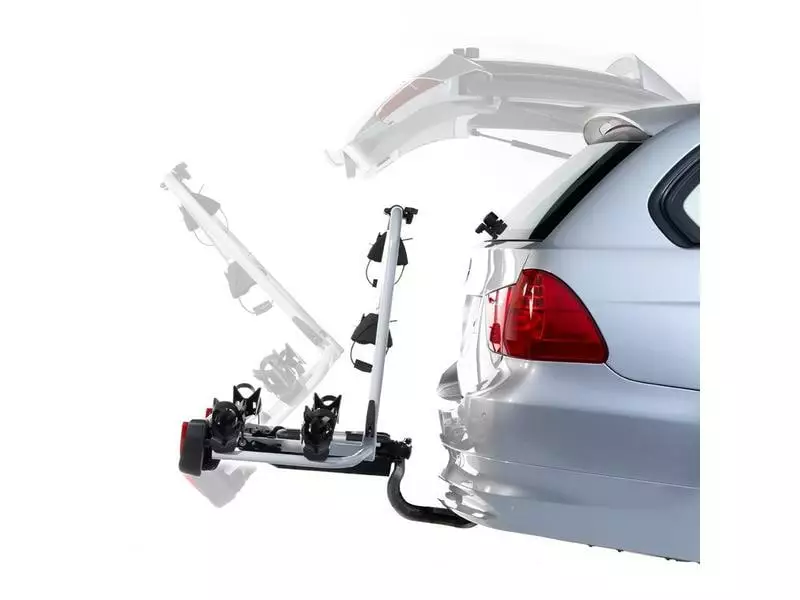 230 mm grosse Abstände zwischen den Fahrradschienen für ausladende Elektromotoren und Akkus. Gesicherter Abklappmechanismus für schnellen Zugang zum Kofferraum, selbst im beladenen Zustand. Crash- und ausweihstabitl. Optional gibt es auch noch eine Auffahrschiene.