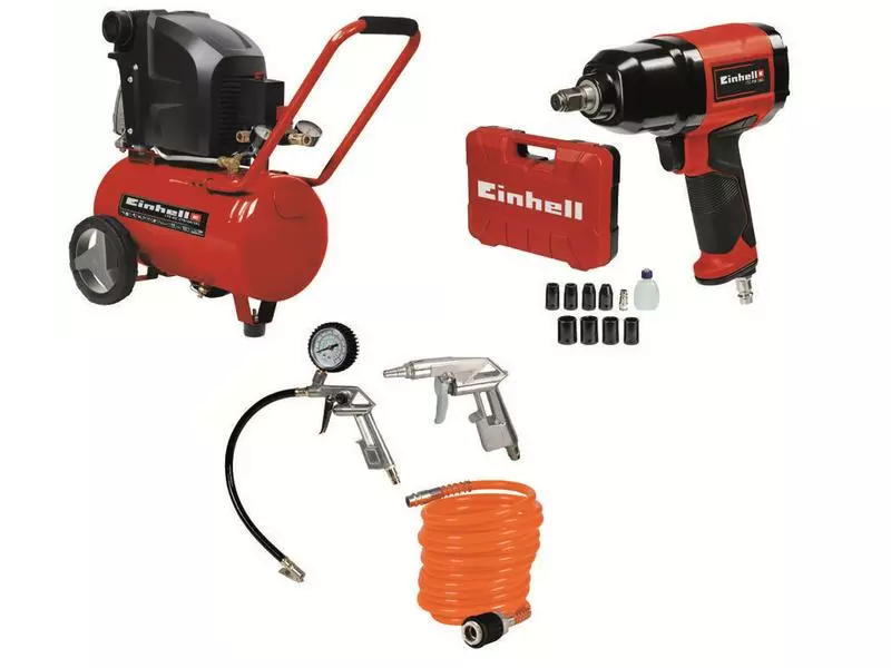 Das Einhell Druckluftset Set ist hilfreich bei einer Vielzahl von Aufgaben in Heim, Werkstatt, Garage und in der Freizeit. Das Set ist passend für Kompressoren mit einem Arbeitsdruck von mindestens 8 bar. Die Ausblaspistole ist ideal zum Reinigen von Oberflächen und Arbeitsbereichen und kann auch hartnäckigen Schmutz in Ritzen und Zwischenräumen beseitigen. Ob zur Kontrolle des Reifendrucks oder für das Befüllen von Reifen, der Reifenfüller ist stets zur Hand und im Nu angeschlossen. Enthalten ist auch die Schnellkupplung zum schnellen Wechsel der Werkzeuge.