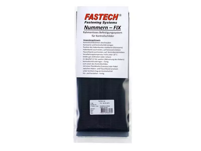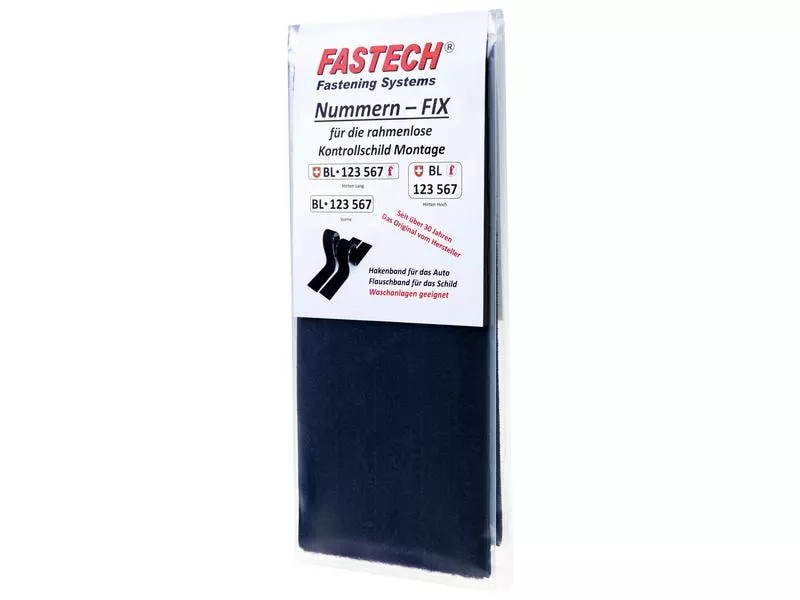 Das Fastech Kontrollschild Befestigungsset dient der rahmenlosen Montage Ihres Nummernschilds. Dazu schrauben Sie den Kontrollschildrahmen ab, reinigen Karosserie und Kontrollschild, markieren die Position des Hakenbandes und schneiden dieses entsprechend zu, um das Hakenband auf die Karosserie und das Flauschband auf das Kontrollschild zu kleben. Im Idealfall warten Sie zwölf Stunden und lassen dem Kleber somit Zeit, sich zu aktivieren, ehe Sie das Kontrollschild anbringen. Wollen Sie das Schild wieder lösen, so müssen Sie lediglich mit einer Plastikkarte oder einer Rakel zwischen Haken- und Flauschband ansetzen und unter leichtem Zug am Kontrollschild hin- und herziehen.