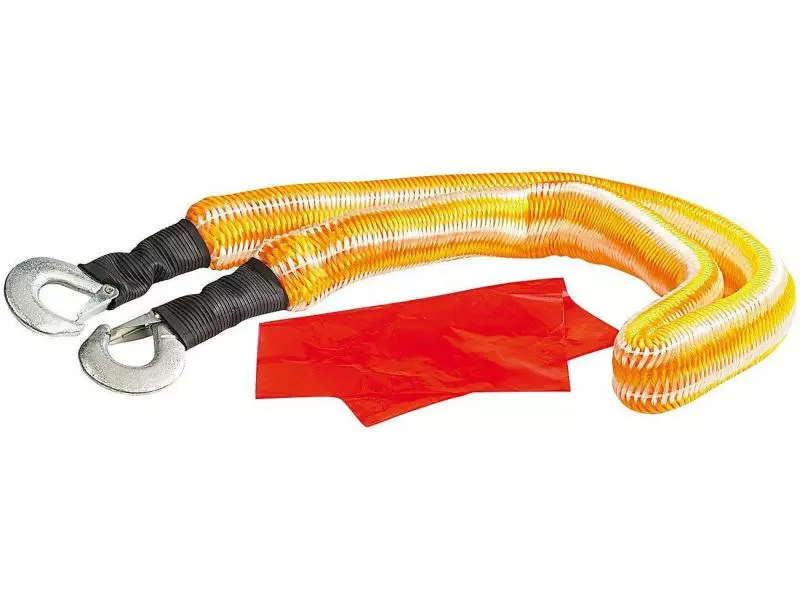 Mit diesem elastischen Abschleppseil können Sie auch schwere Fahrzeuge bis zu einem zulässigen Gesamtgewicht von 2800 kg abschleppen. Das reissfeste Seil ist aus Polyethylen gefertigt und extra elastisch. Es wird per zwei Haken befestigt und in einer Aufbewahrungstasche geliefert. So haben Sie im Notfall immer ein stabiles Abschleppseil parat.