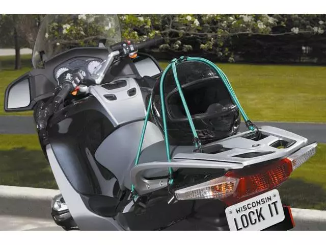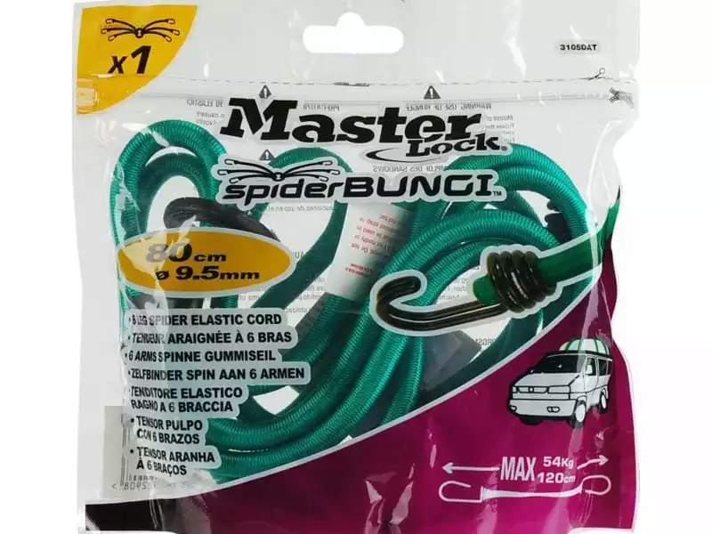 Das Gummi Spannseil Spinne des Herstellers Masterlock dient zur Fixierung von Fracht und wurde für die Anwendung auf Motorrädern und Rollern konzipiert. Das dehnbare Seil besitzt insgesamt sechs Enden, die mit einem Haken versehen wurden. Diese können an Haken, Ecken und Kanten eingehakt werden und sichern so die unter dem Seil liegende Fracht.