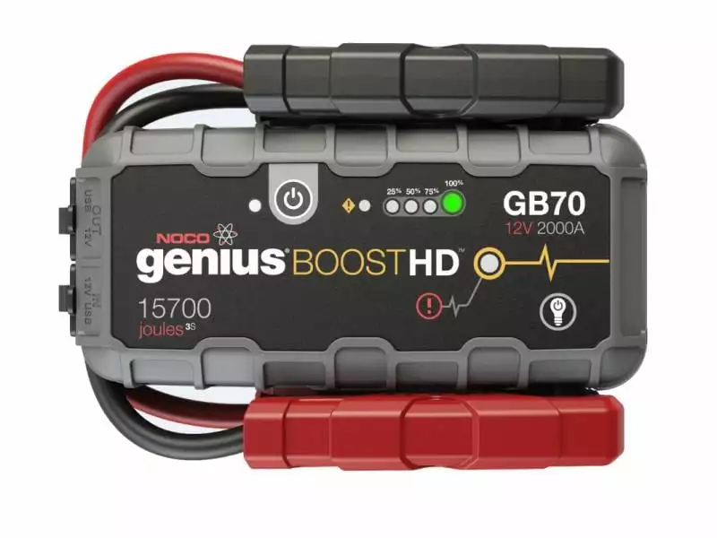 Der Noco Genius GB70 ist eine leistungsstarke Powerbank mit integrierter Starthilfefunktion für Autos und Motorräder. Der integrierte Lithium-Ionen-Akku besitzt eine Kapazität von 55 Wh und lässt sich wahlweise per USB-Anschluss oder mit 12 Volt am Zigarettenanzünder des Autos laden. Dabei ist eine Ladung ausreichend für bis zu 40 Startvorgänge von Ottomotoren mit bis zu acht Litern Hubraum oder Dieselmotoren mit bis zu sechs Litern Hubraum.