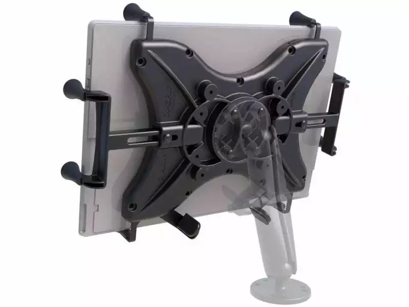 Das Halterungssystem vom «RAM Mount» ist modular aufgebaut. Jede Halterung besteht aus einer Basis (Base), einem Arm und einem Kopfteil (Top). Je nach Halterung werden diese miteinander verschraubt, meist aber über ein Kugelgelenk zusammengesteckt. Dies bietet Flexibilität in der Ausrichtung, sorgt aber zusammen mit dem Material für einen schock- und vibrationsdämpfenden Effekt.