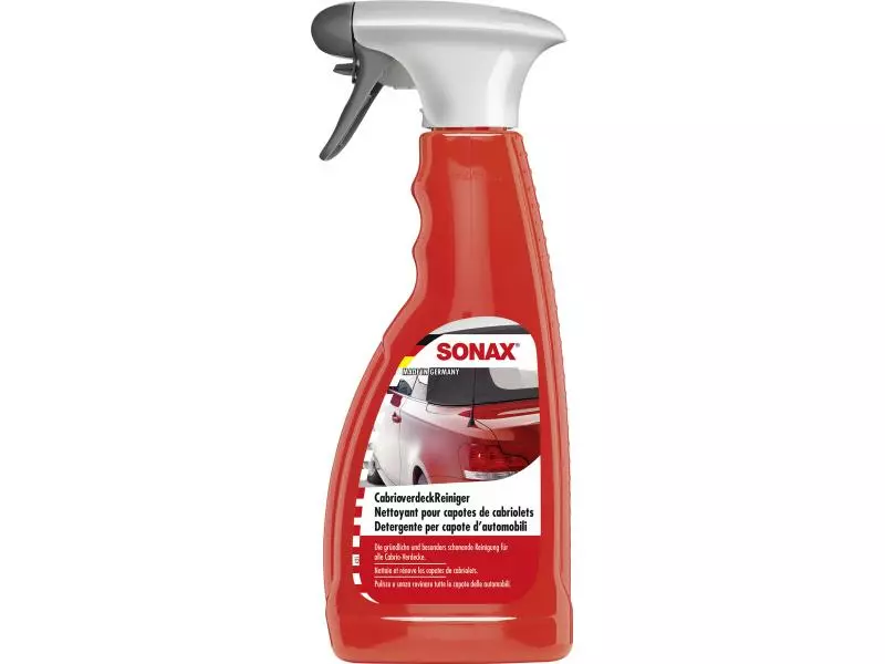 Umweltgerecht, da ohne Treibgas und Lösemittel. Wiederverwendbare Kunststoff-Flasche. Der hochaktive Spezialreiniger beseitigt schnell und gründlich selbst hartnäckige Verschmutzungen. Problemlos während der Wagenwäsche anzuwenden. SONAX Cabrio-Verdeck-Reiniger greift Originallackierungen nicht an. Stoffverdecke anschliessend mit SONAX Gewebe-Imprägnierung nachbehandeln.