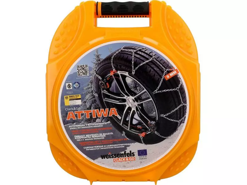 Die Schneekette für maximalen Fahrkomfort, selbst spannend und selbst zentrierend dank der zwei automatischen Spannungsvorrichtungen. Die Weissenfels-Schneeketten ATTIWA Clack & Go Schneekette 9 mm Gr.8 eignen sich für folgende Reifengrössen: