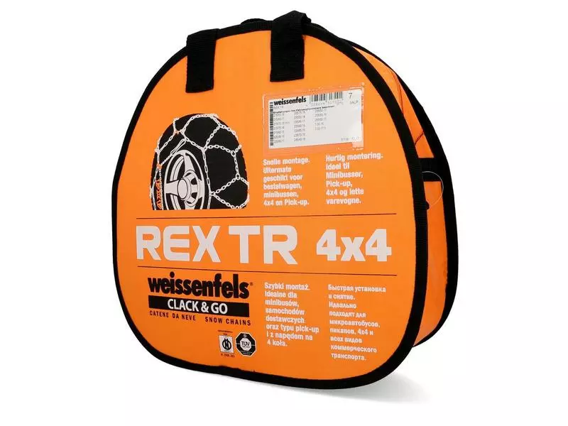Die Kette mit professioneller Leistung und schnell zu montieren. Ideal für Minibusse, Pickup, 4 x 4 und Leichttransportfahrzeuge. Ersatzglieder und Plastikhandschuhe sind in der praktischen Aufbewahrungstasche inbegriffen. Die Weissenfels-Schneeketten TR 4 x 4 Gruppe 7 eignen sich für folgende Reifengrössen: