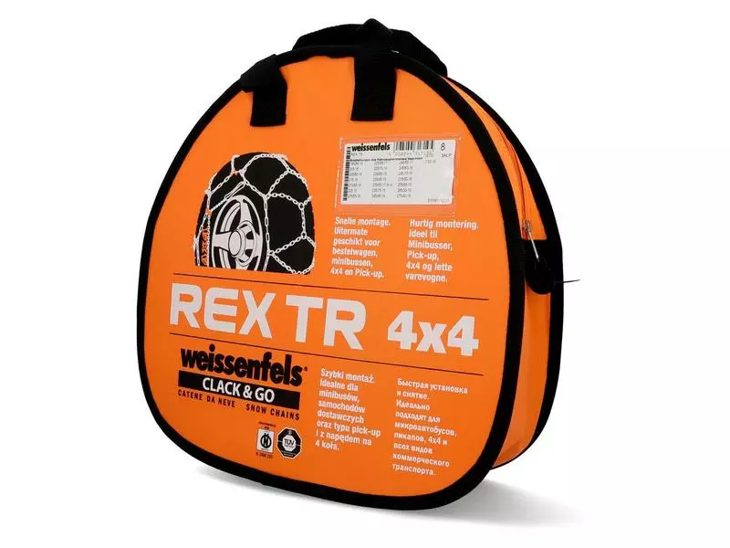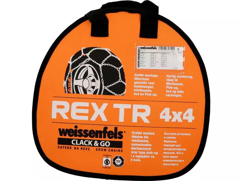 Die Kette mit professioneller Leistung und schnell zu montieren. Ideal für Minibusse, Pickup, 4 x 4 und Leichttransportfahrzeuge. Ersatzglieder und Plastikhandschuhe sind in der praktischen Aufbewahrungstasche inbegriffen. Die Weissenfels-Schneeketten TR 4 x 4 Gruppe 8 eignen sich für folgende Reifengrössen: